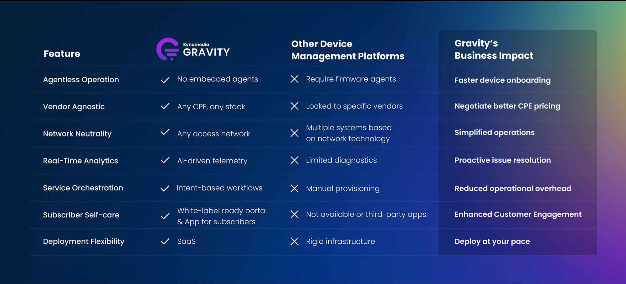 That’s why Synamedia Gravity was built agentless by design—to give service providers the freedom to choose, the power to scale, and the control to differentiate.
